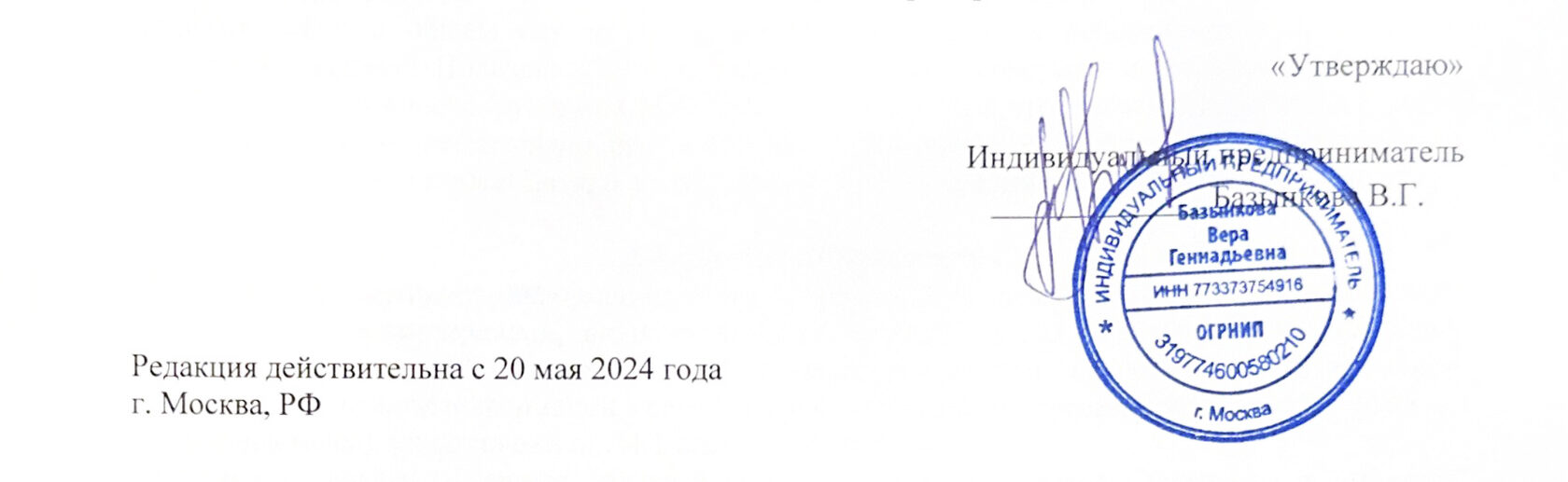 - 1.1.Настоящая Политика в отношении обработки персональных данных (далее – «Политика») издана и применяется Индивидуальным предпринимателем Базынковой Верой Геннадьевной (ИНН: 773373754916, ОГРНИП: 319774600580210), (далее – «Оператор») в соответствии с Федеральным законом от 27.07.2006 № 152-ФЗ «О персональных данных» (далее – Закон) с учетом положений General Data Protection Regulation (Regulation (EU) 2016/679) от 27 апреля 2016 года (далее – «GDPR»).
