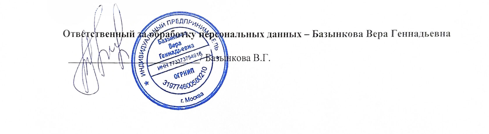 Настоящая Политика конфиденциальности (далее – «Политика») действует в отношении обработки персональных данных Пользователей информационных ресурсов, владельцем которых выступает индивидуальный предприниматель Базынкова Вера Геннадьевна (ИНН: 773373754916, ОГРНИП: 319774600580210), (далее – «Оператор»).